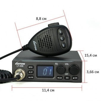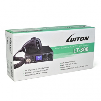 Автомобильная рация Luiton LT-308 работает в безлицензионном гражданском диапазоне 27МГц. Модель LT-308 имеет инверсионный ЖК-дисплей с синей подсветкой, на котором отображается номер выбранного канала, режим модуляции и другие активные функции.