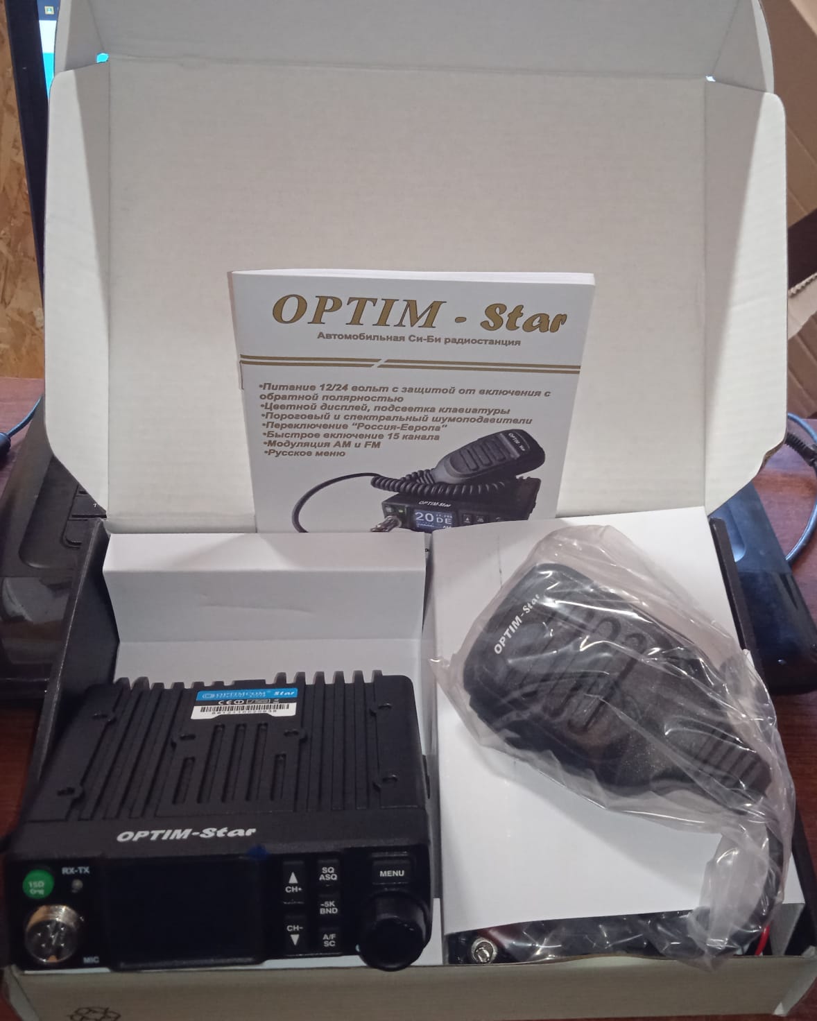 Автомобильная радиостанция Optim-Star - новинка в семействе раций Optim. Радиостанция работает в частотном диапазоне 26965 - 27405 МГц . На передней панели находится разъем для подключения тангенты, кнопка быстрого доступа к 15 каналу, кнопка переключения "Европа/Россия", большой и яркий большой TFT дисплей с индикатором канала на котором находится пользователь, регуляторы спектрального и порогового шумоподавления, кнопки переключения каналов и регулятор громкости, который так же отвечает за включение/выключение рации. Все кнопки и регуляторы имеют яркую подсветку и их без труда можно будет увидеть в темное время суток.Optim-Star имеет выходную мощность до 8 Ватт, режим работы АМ/FM. Громкие динамики позволяют всегда расслышать всю необходимую информацию, но есть возможность подключения внешнего громкоговорителя.